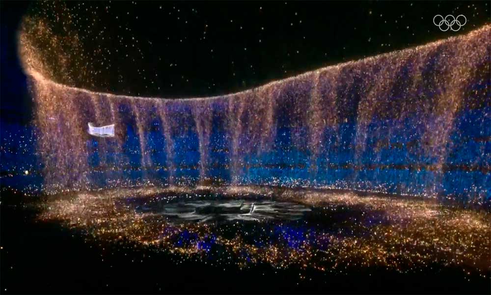 En un show de luces de "realidad aumentada", partículas de luz que inundaron el estadio formaron los aros olímpicos. "Un símbolo atemporal de unidad mundial que reúne a millones en una celebración compartida", explicaron los organizadores.