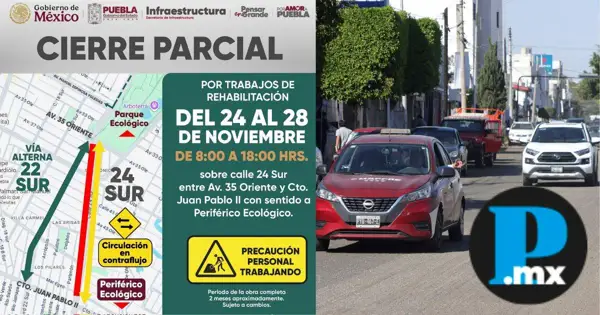 Durante esta semana, el tránsito en algunas calles de Puebla sufrirá cambios por trabajos de rehabilitación. La 24 Sur, entre la 35 Oriente y el Circuito Juan Pablo II, seguirá con cierre parcial en dirección al Periférico Ecológico, con contraflujo habilitado para mantener la circulación. El horario de intervención será de 8:00 a 18:00 horas, y se estima que las obras duren aproximadamente dos meses. Además, del 24 al 28 de noviembre, la 12 Oriente, entre Habana y 32 Norte, también tendrá cierre parcial en dirección hacia la 24 Sur. El Gobierno de Puebla pide a las y los conductores manejar con precaución en ambas zonas. Para quienes buscan rutas alternas y evitar retrasos, se recomiendan las siguientes opciones: