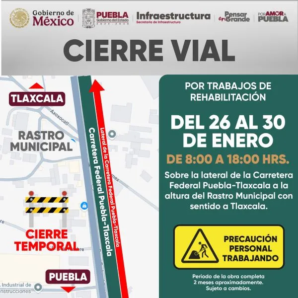 Automovilistas que circulan por la zona metropolitana de Puebla deberán tomar precauciones debido a cierres viales programados en dos importantes vialidades: la autopista México-Puebla y la carretera federal Puebla-Tlaxcala. Las restricciones al tránsito se realizarán durante cinco días, del lunes 26 de enero al viernes 30 de enero, informó la Secretaría de Infraestructura. De acuerdo con la dependencia estatal, ambos cierres iniciaron este lunes y se mantendrán hasta el final de la semana, aunque se realizarán únicamente en horarios determinados, con el objetivo de reducir las afectaciones a la circulación vehicular. Te puede interesar: ¡Atención conductores! Obras provocarán cierres en la México-Puebla esta semana En el caso de la autopista México-Puebla, el cierre será parcial y se llevará a cabo del 26 al 30 de enero, en un horario de 10:00 a 18:00 horas. Las labores se concentrarán en el tramo comprendido entre la desviación hacia la Vía Corta Santa Ana y la Avenida Alfredo Toxqui. En este punto se cerrarán dos carriles debido a trabajos de imagen urbana que se desarrollarán en el camellón central. ![]() En tanto, en la carretera federal Puebla-Tlaxcala, las afectaciones serán mayores, ya que se contempla el cierre total de la lateral. Este bloqueo se aplicará en las mismas fechas, del 26 al 30 de enero, pero en un horario más amplio, de 8:00 a 18:00 horas. El cierre en esta vialidad se ubicará a la altura del Rastro Municipal, con sentido hacia la Ciudad de México. En el lugar se realizarán trabajos de rehabilitación.