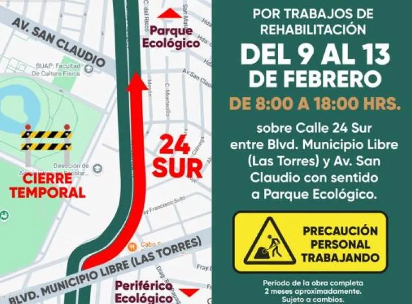 Debido a obras de rehabilitación vial, la circulación sigue cerrada en la 24 Sur, en el tramo que va del bulevar Municipio Libre (Las Torres) a la avenida San Claudio, en sentido hacia el Parque Ecológico, por lo que se pide a los automovilistas tomar precauciones. El cierre se debe a trabajos que realiza el Gobierno del Estado de Puebla como parte del mejoramiento de la vialidad. Para que las labores avancen sin riesgos, el paso de vehículos permanece suspendido en este punto. Si transitas por la zona, utiliza vías alternas y considera salir con tiempo, ya que el cierre ha provocado carga vehicular, sobre todo en horas pico. La recomendación es planear el recorrido y evitar este tramo si no es necesario.