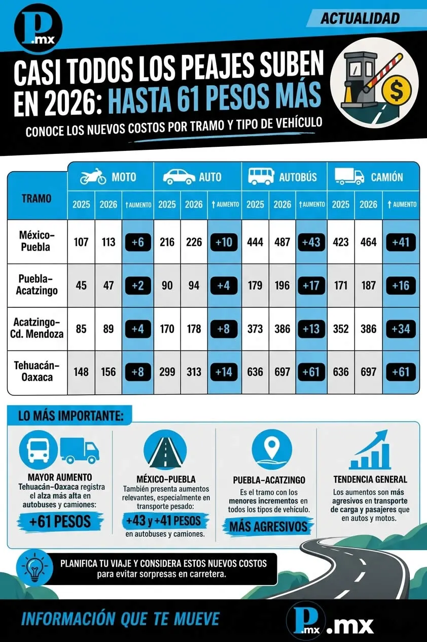 ¿Cuánto aumentaron las casetas en Puebla?Ahora, viajar por todo el recorrido de la autopista Tehuacán–Oaxaca, que atraviesa municipios como Santiago Miahuatlán, tiene los siguientes costos: para motociclistas, la tarifa pasó de 148 a 156 pesos, es decir, un incremento de 8 pesos. En el caso de los automovilistas, el costo subió de 299 a 313 pesos, lo que representa un alza de 14 pesos. El impacto es mayor para el transporte de pasajeros y de carga. Los autobuses y camiones pasaron de pagar 636 pesos en 2025 a 697 pesos en 2026, un aumento de 61 pesos, el más elevado registrado en esta actualización de tarifas. En la autopista México–Puebla, una de las más transitadas del país por conectar a la capital con municipios como San Martín Texmelucan, Huejotzingo y Amozoc, el ajuste también fue generalizado. Para motociclistas, la tarifa pasó de 107 a 113 pesos, un aumento de 6 pesos, mientras que para automóviles subió de 216 a 226 pesos, es decir, 10 pesos más.