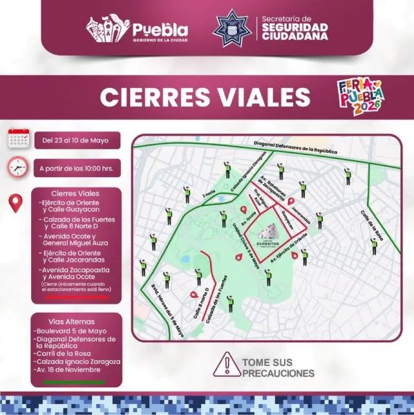 El gobierno de la ciudad implementará cierres viales por la Feria de Puebla 2026, que se llevará a cabo en la zona de los Fuertes de Loreto y Guadalupe, por lo que solicita a los automovilistas utilizar vías alternas durante las próximas semanas. Las restricciones comenzarán diariamente a partir de las 10:00 horas y estarán vigentes del 23 de abril al 10 de mayo, con el objetivo de facilitar el acceso y la estancia de los visitantes durante el desarrollo del evento. Te puede interesar: Feria de Puebla 2026 será vigilada por 300 elementos de la Guardia Nacional Entre las vialidades que estarán cerradas se encuentran los cruces de Ejército de Oriente y Calle Guayacán, así como Calzada de los Fuertes y Calle 8 Norte D. También se verán afectadas Avenida Ocote y General Miguel Auza, además de Ejército de Oriente y Calle Jacarandas. En el caso de Avenida Zacapoaxtla y Avenida Ocote, el cierre se aplicará únicamente cuando el estacionamiento de la zona se encuentre lleno, por lo que esta restricción dependerá de la afluencia vehicular registrada en el área.