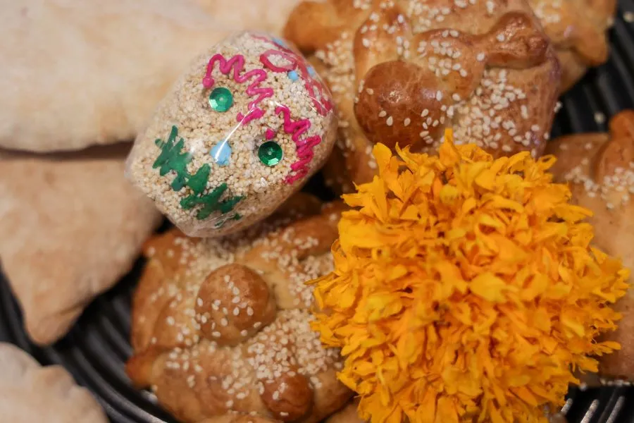 Pan de muerto: Simboliza el ciclo de la vida y la muerte, la bolita al centro significa el cráneo o corazón del difunto, mientras que las tiras son los huesos.