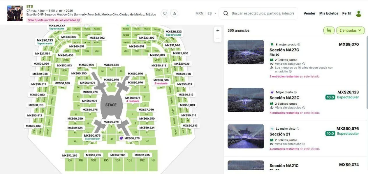 La reventa de boletos para el regreso de BTS a México alcanzó cifras récord este viernes, con entradas ofertadas por más de 120 mil pesos, apenas horas después de que se agotara la preventa oficial del concierto programado para el 7 de mayo. El fenómeno se detonó tras una preventa marcada por fallas técnicas y saturación del sistema, situación que dejó fuera a miles de seguidores. Minutos después de liberarse los accesos, los boletos desaparecieron de las plataformas oficiales y comenzaron a reaparecer en sitios de reventa con precios que superan ampliamente su costo original. En páginas como Viagogo, los precios publicados este 23 de enero evidencian el nivel de especulación. Algunas localidades en la Sección 9 se ofrecen hasta en 121 mil 992 pesos, mientras que en la Sección 21 los montos oscilan entre 59 mil pesos y el mismo tope máximo.