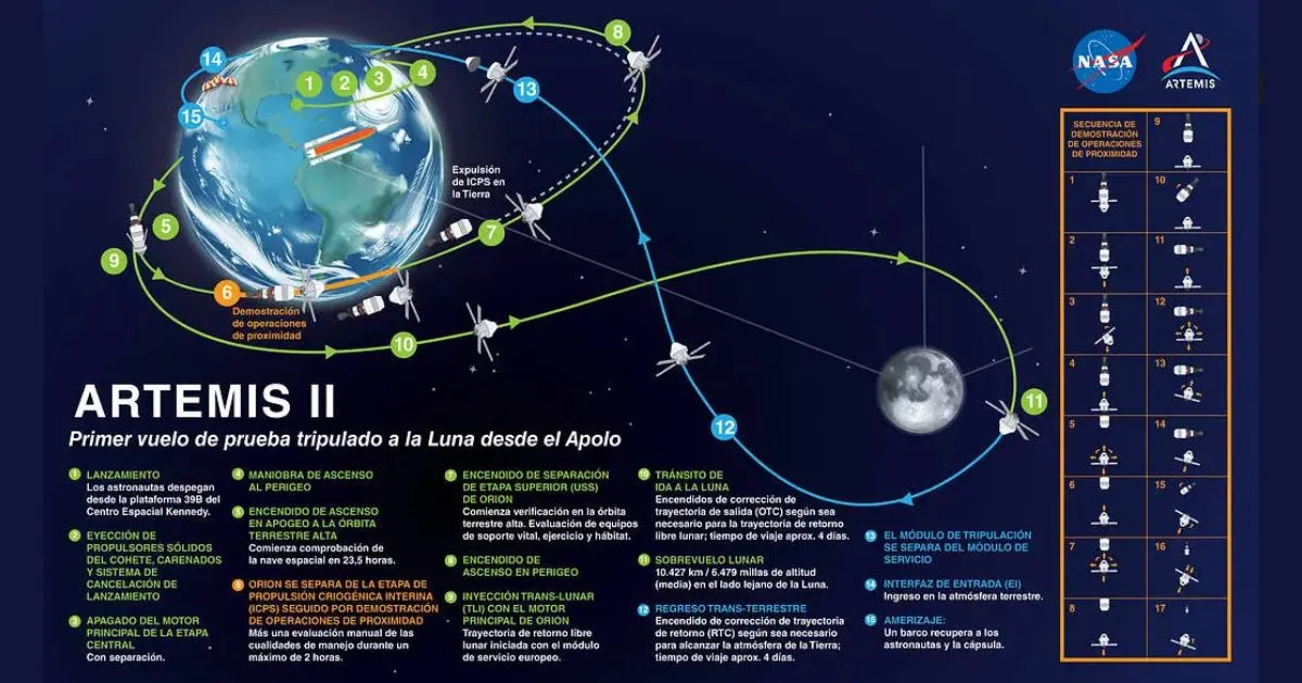 Este será el recorrido de Artemis II / NASA Artemis II es considerada una misión de prueba, similar a lo que representó Apolo 8, con el objetivo de comprobar el funcionamiento de los sistemas, incluidos los de soporte vital, en condiciones reales. Esta fase es fundamental para reducir riesgos en futuras misiones que buscarán aterrizar en el satélite natural. Uno de los aspectos destacados es su relevancia histórica y social: por primera vez participarán en una misión lunar una mujer, una persona afrodescendiente y un astronauta no estadounidense, lo que marca un avance hacia una exploración espacial más inclusiva.