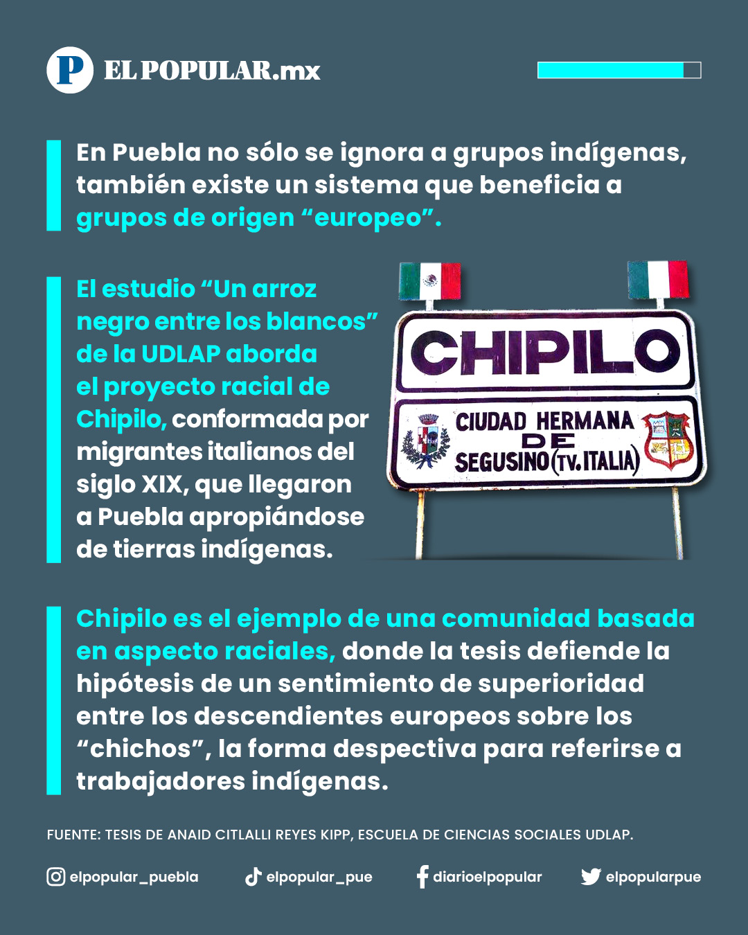 En Puebla no sólo se ignora a grupos indígenas, también existe un sistema que beneficia a grupos de origen “europeo”. El estudio “Un arroz negro entre los blancos” de la UDLAP aborda el proyecto racial de Chipilo, una comunidad conformada por migrantes italianos del siglo XIX. La cual llegó a Puebla mediante mecanismos de apropiación de tierras indígenas. Chipilo es el ejemplo de una comunidad basada en aspecto raciales, donde la tesis defiende la hipótesis de un sentimiento de superioridad entre los descendientes europeos sobre los “chichos”, la forma despectiva para referirse a trabajadores indígenas.