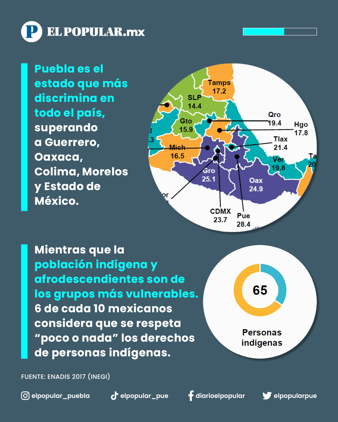 Puebla es el estado que más discrimina en todo el país, superando a Guerrero, Oaxaca, Colima, Morelos y Estado de México. Mientras que la población indígena y afrodescendientes son de los grupos más vulnerables. 6 de cada 10 mexicanos considera que se respeta “poco o nada” los derechos de personas indígenas.