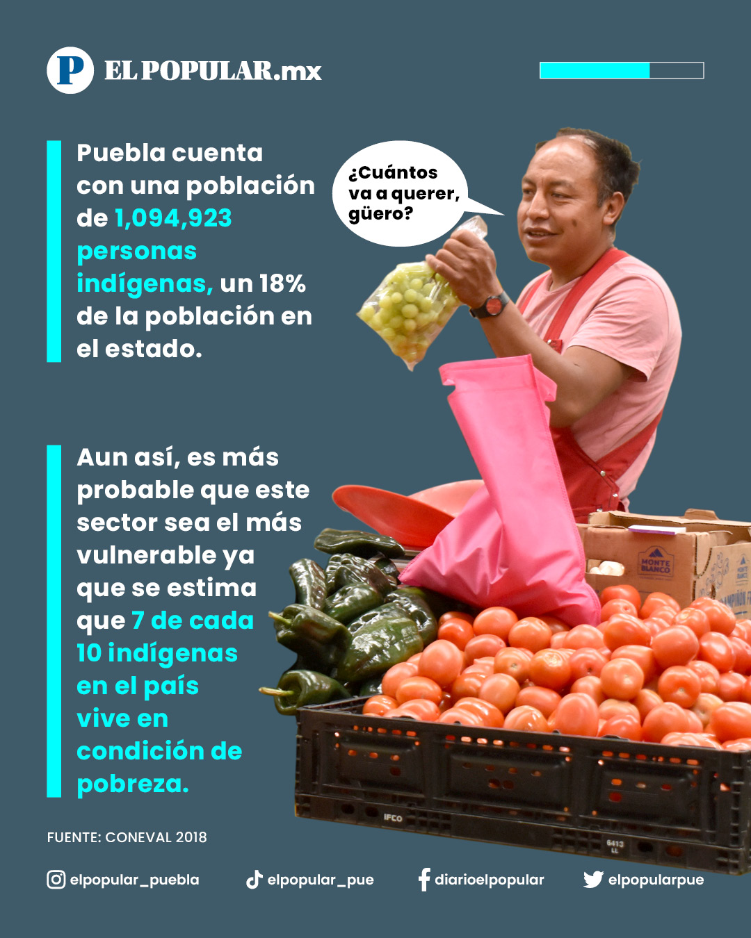 Puebla cuenta con una población de 1,094,923 personas indígenas, un 18% de la población en el estado. Aun así, es más probable que este sector sea el más vulnerable ya que se estima que 7 de cada 10 indígenas en el país vive en condición de pobreza.