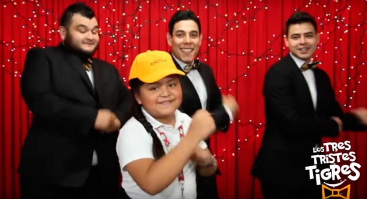 Andrea Lomelí, la niña que corrigió al secretario de Educación Pública, Aurelio Nuño, al indicarle la manera correcta de pronunciar la palabra "leer", en vez de "ler", acompañó al grupo 'Los Tres Tristes Tigres' en su más reciente video musical. Con el fondo de 'El Burrito Sabanero', el trío de Nuevo León hace un listado sobre los propósitos del año siguiente, entre los que están ahorrar dinero, viajar, comer más sano y ser vegano, así como obtener el hábito de la lectura. "Comprarme libros, ser más culto es mi propósito y lo haré. El hábito de la lectura yo lo tengo que tener. Voy a ler, voy a ler, lo prometo que lo haré", cantan con acordeón y guitarra. Pero no tan rápido, porque Andrea aparece en el video con uniforme escolar y una gorra amarilla con su nombre para recordarles cómo es la correcta pronunciación correcta: "Pero se dice leer", canta Andrea al ritmo del villancico con todo y coreografía. Los regiomontanos le contestan que "tranqui, tranqui, tranqui, tranqui, mis propósitos serán porque así si no los cumplo ya no me voy a agüitar" "Tranqui tranqui tranqui tranqui, ya no voy a ser tan hocicón, para qué le tiro a mucho si ya sé que está cabrón". Este grupo se hizo famoso a través de YouTube por componer canciones chuscas sobre escenas de la vida cotidiana de los jóvenes, pero cantándolas al ritmo de la música de bolero. En la actualidad protagonizan la campaña de la Consar para invitar a los mexicanos a hacer aportaciones voluntarias a sus cuentas de ahorro para el retiro. |