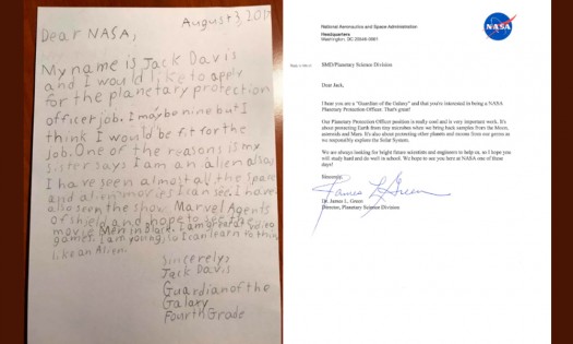 La Agencia Aeronáutica Espacial (NASA, por sus siglas en inglés) convocó a científicos o expertos para un puesto de trabajo titulado director de Protección Planetaria. Lejos de evitar que formas de vida extraterrestre invadan el planeta Tierra, el puesto consiste en que la tecnología de la NASA no contamine el espacio exterior. Pero Jack Davis, un niño de Estados Unidos, envió una carta al la NASA donde solicitó el puesto como guardián de la Galaxia. Querida NASA: Me llamo Jack Davis y me gustaría presentarme al puesto de director de protección planetaria. Puede que tenga nueve años, pero creo que encajaría en el puesto. Uno de los motivos es que mi hermana dice que soy un alien. Además, he visto casi todas las películas del espacio y de aliens que puedo ver. Además, he visto el programa Marvel 'Agents of S.H.I.E.LD.' y quiero ver la película "Hombres de Negro". Se me dan muy bien los videojuegos. Soy joven, así que puedo aprender a pensar como un alien. Sinceramente Jack Davis. Guardián de la Galaxia. Cuarto curso. La carta fue publicada en Facebook y en Twitter, desde entonces varios usuarios y medios estadounidenses han hecho eco a la carta del niño de Nueva Jersey. Jonathan Rall, director de investigación planetaria de la NASA, le contestó la carta al niño, y también le llamó por teléfono para felicitarle por su interés en la vacante. Querido Jack: He escuchado que eres un "Guardián de la Galaxia" y que estás interesado en convertirte en el director de protección planetaria de la NASA. ¡Eso es fantástico! El puesto es genial y es un trabajo muy importante. Consiste en proteger a la Tierra de pequeños microbios cuando traemos muestras de la Luna, de asteroides o de Marte. Además, también consiste en proteger a otros planetas y satélites de nuestros gérmenes, ya que exploramos con responsabilidad el Sistema Solar. Siempre estamos buscando científicos e ingenieros con futuro para ayudarnos, así que espero que estudies mucho y te portes bien en el colegio. Esperamos verte en la NASA un día de estos. Sinceramente Jim Green Directos, División de Ciencia Planetaria