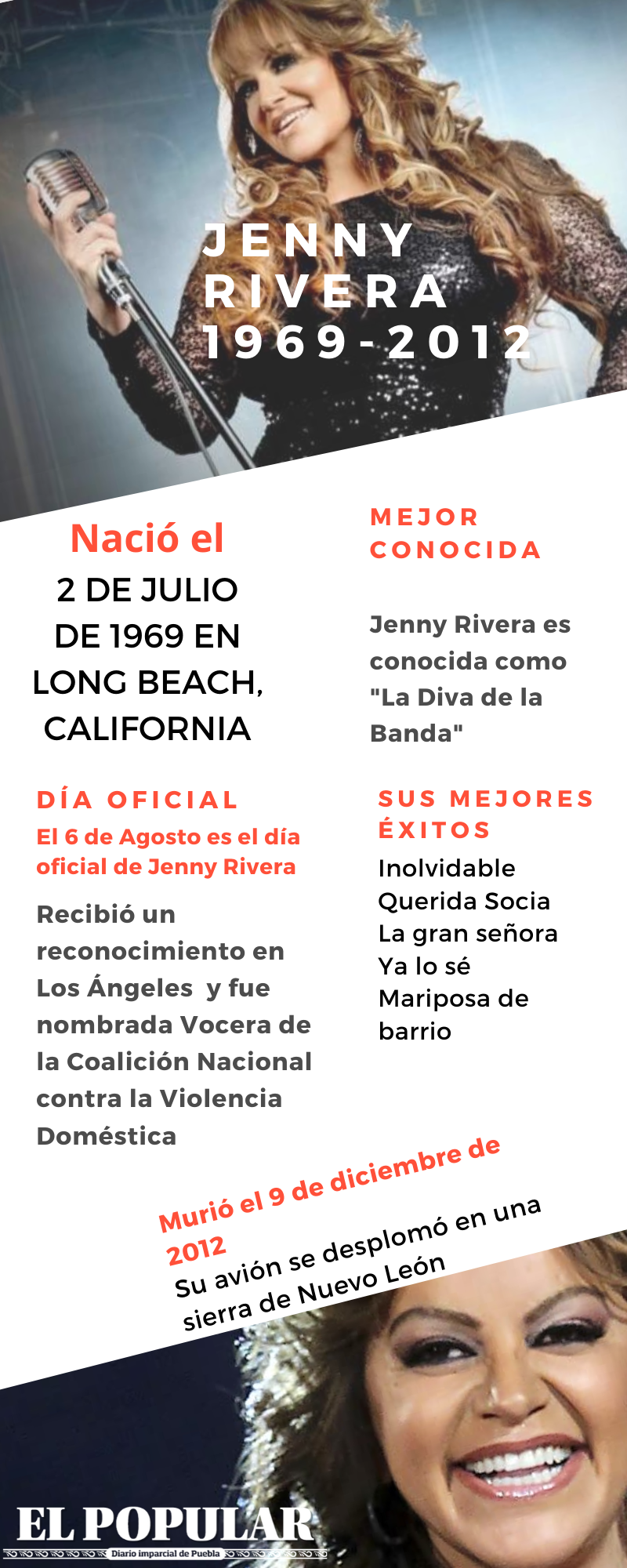 La Diva viajaba con 5 personas, entre ellas su publirrelacionista Arturo Rivera y Jacob Yebale. Su avión se desplomó en la sierra de Nuevo León, donde más tarde autoridades confirmaron su fallecimiento. También puedes leer: Llegará La Casa de Papel 4 a Netflix Datos curiosos de Jenny Rivera Nació el 2 de julio de 1969 en Long Beach, California A principios de 1999 grabó y editó por sí sola su disco de género ranchero “Si quieres verme llorar”. En junio de ese mismo año, grabó “Reyna de Reynas”, disco de corridos producido por su padre y que la dio a conocer como “La primera dama del corrido”. Su primer éxito en la radio de Estados Unidos fue “Las malandrinas”, canción totalmente compuesta por ella.