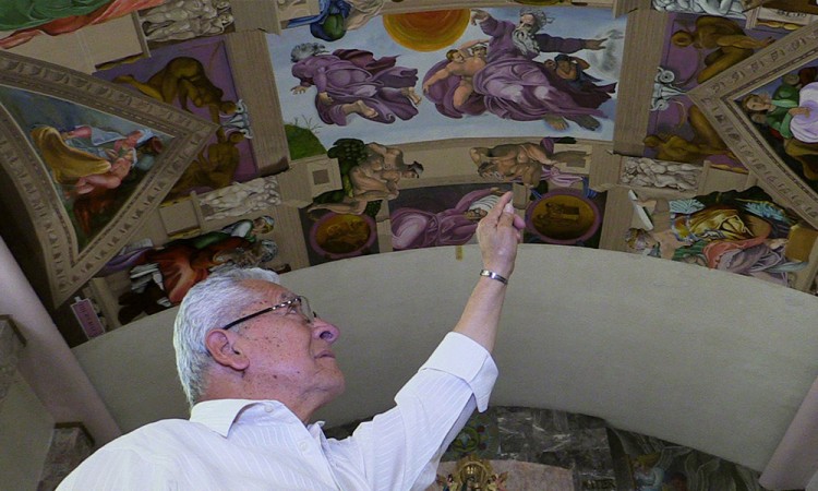 A sus más de 70 años, Miguel Macías camina sonriente en una iglesia mientras recibe la felicitación de algunos feligreses. Los cumplidos lo valen, pues ha invertido las últimas dos décadas en llevar la emblemática Capilla Sixtina a un humilde barrio de Ciudad de México, donde pocos pueden visitar Roma. Una pura coincidencia fue la que llevó a este diseñador jubilado a pintar una réplica exacta de la más célebre obra de Miguel Ángel ("Michelangelo") en el techo de la Parroquia Nuestra Señora del Perpetuo Socorro, en el noreste de la capital mexicana. Cuando en 1999 fue invitado por un amigo a Roma, no perdió la oportunidad de visitar el Vaticano. Allí comenzó a medir con pasos el tamaño de la capilla: uno, dos, tres... Las medidas eran casi idénticas a las de la parroquia que frecuentaba en su barrio. "Las medidas se parecían y tuve la idea que lo podíamos pintar aquí", contó Macías. Al regresar a Ciudad de México, se reunió con el padre de la parroquia y le propuso la idea: "Le dije que me acababa de jubilar y tenía todo el tiempo del mundo".
