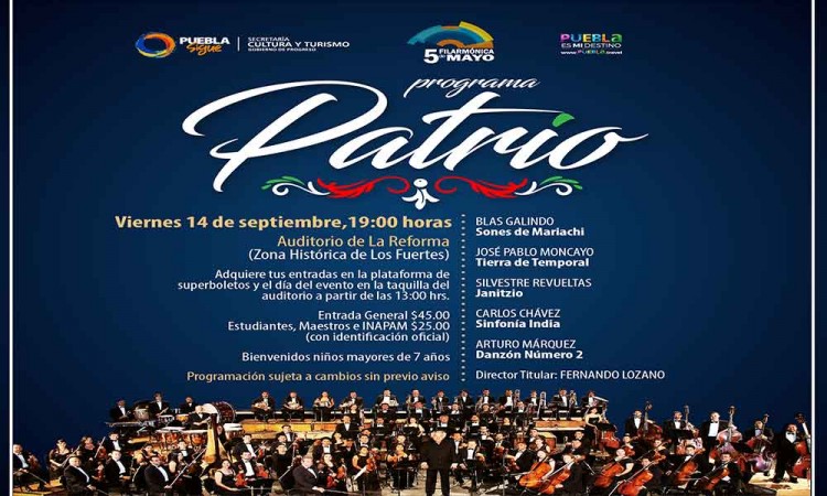 Como parte de la conmemoración del 208 Aniversario de la Independencia de México, la Filarmónica 5 de Mayo ofrecerá este viernes un programa con piezas y autores íconos de la música nacional. En esta presentación especial, la filarmónica interpretará canciones de grandes exponentes como Blas Galindo, José Pablo Moncayo, Carlos Chávez, Silvestre Revueltas y Arturo Márquez. Destacan las piezas: "Sones de Mariachi" que fue interpretada por primera vez en 1940 en el Museo de Arte Moderno de Nueva York, en ella se incorporan tres tonadas populares: el son de la negra, los cuatro reales y el zopilote; música característica del conjunto de mariachi jalisciense. Además, "Tierra de Temporal" un delicioso poema sinfónico escrito en 1949 y utilizada por Guillermo Arriaga en 1953, para dar vida al ballet "Zapata", una de las coreografías de mayor impacto en la danza mexicana. Como parte del programa, los asistentes también podrán disfrutar de melodías como: Sinfonía India (1935), Janitzio (1933) y Danzón número 2 (1994). El acceso tiene un costo de 40 pesos por persona y puede adquirirse en las taquillas del Auditorio de la Reforma, ubicado en la Zona de los Fuertes. |