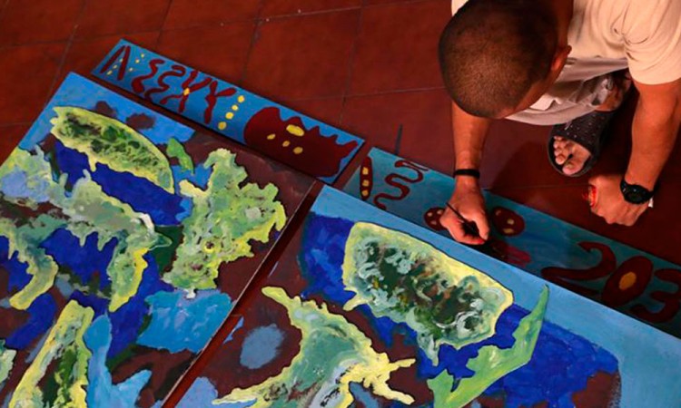 En este sentido, el reo tomó la idea de hogar como algo mucho más global, en este caso el planeta Tierra, representado aquí con llamativos colores verdes y azules.
