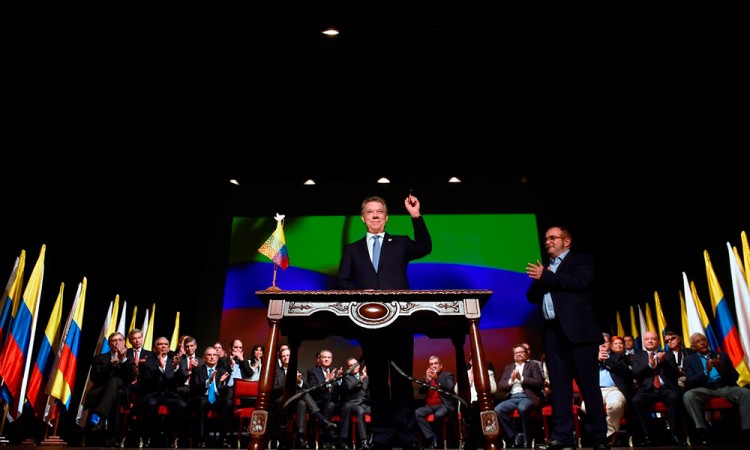 Tras el rechazo del primer acuerdo de paz, el presidente colombiano Juan Manuel Santos y el máximo comandante de la guerrilla de las FARC, Rodrigo Londoño, "Timochenko", firmaron un nuevo acuerdo, en el que su objetivo más importante es el cese al fuego entre ambas partes. El nuevo pacto sustituye al que fue suscrito el 26 de septiembre y que busca acabar con 52 años de confrontación armada entre el Estado y ese grupo guerrillero. En el Teatro Colón de Bogotá, el gobierno y las Fuerzas Armadas Revolucionarias de Colombia (FARC) pusieron fin a más medio siglo de conflicto armado con un acuerdo que sería refrendado en el Congreso la próxima semana. "Este acuerdo pone fin a siete décadas de violencia, medio siglo de violencia abierta, un lustro de negociaciones en la Habana, el desencanto del pasado 2 de octubre y el histórico esfuerzo de conseguir el mayoritario de la nación", aseguró "Timochenko". El líder de las FARC aseguró que el nuevo pacto incluyó todas las propuestas y aclaraciones de todos los grupos sociales, los que estaban a favor y en contra del cese al fuego. Además, agradeció a todas las personas que apoyaron la firma. "Nuestro sentimiento de solidaridad y admiración a las y los miles de compatriotas que salieron a las calles y plazas de ciudades y pueblos a manifestarse contra la guerra y a exigir a las partes sentadas a no pararse hasta firmar un acuerdo definitivo", dijo. Horas antes, el jefe negociador de la guerrilla, Iván Márquez, escribió en su cuenta en Twitter: "Con la firma del Acuerdo Final hoy, la esperanza de paz cobra vida. Será como una obra de autoconstrucción en la que debemos trabajar todos". A primeras horas de la tarde, y ya firmado, el texto será llevado al Congreso, de mayoría oficialista y donde se espera quede refrendado la próxima semana. |