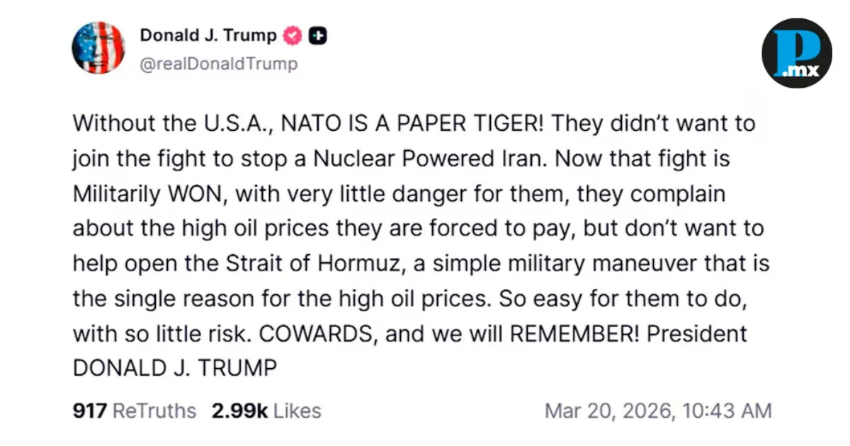 El presidente estadounidense, Donald Trump, arremetió este viernes 20 de marzo contra los aliados de la OTAN por su falta de apoyo a la guerra de Estados Unidos e Israel contra Irán, calificando a los aliados históricos de Washington de “cobardes”.