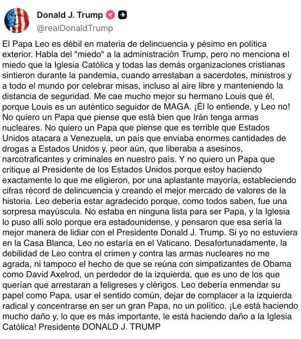 El presidente estadounidense, Donald Trump, mediante una publicación en Truth Social ha lanzado un feroz ataque contra el papa León XIV, acusándolo de ser “débil ante la delincuencia y pésimo en política exterior". Posteriormente, el mandatario declaró ante los periodistas que “no era precisamente un gran admirador suyo”. Por su parte, el papa no se ha quedado callado y ha afirmado que “no le da miedo” la Administración Trump y que continuará pronunciándose en contra de los conflictos bélicos. Ante el estallido del conflicto entre Estados Unidos e Israel en contra de Irán, el papa ha sido firme en criticar la guerra, calificando de “inaceptable” la amenaza de Trump de destruir la civilización iraní entera. Asimismo, el papa ha solicitado al mandatario que encuentre una “vía de salida” para finalizar el conflicto. Las declaraciones de Trump se produjeron cuando el pontífice iniciaba un viaje de 11 días a África, siendo este su segundo viaje al extranjero desde que fue elegido el año pasado. En camino a Argelia, el papa afirmó ante los periodistas que no quería entrar en un debate con Trump, pero que continuará promoviendo la paz. El pontífice mencionó que no consideraba que su papel en el mundo fuera el de un político, sino el de difundir siempre un mensaje de paz.