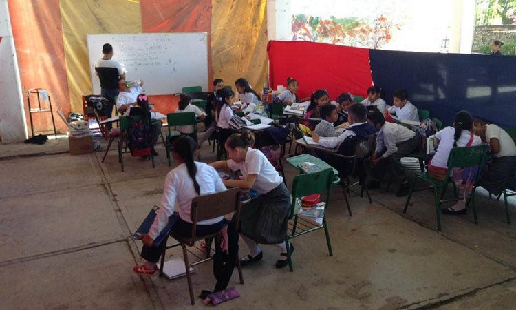 Izúcar de Matamoros.- Padres y profesores de la primaria Emiliano Zapata, ubicada en la junta auxiliar de San Juan Raboso, en Izúcar de Matamoros, se organizaron para iniciar clases en salones improvisados con telas y lonas, en la techumbre de la explanada de la presidencia auxiliar. María Gloria Vivanco Quirós, profesora de la primaria "Emiliano Zapata", comentó que el plantel tiene afectaciones tras el sismo del 19 de septiembre y es inseguro, ante lo cual junto con los padres y la autoridad auxiliar decidieron dar inicio a las clases.