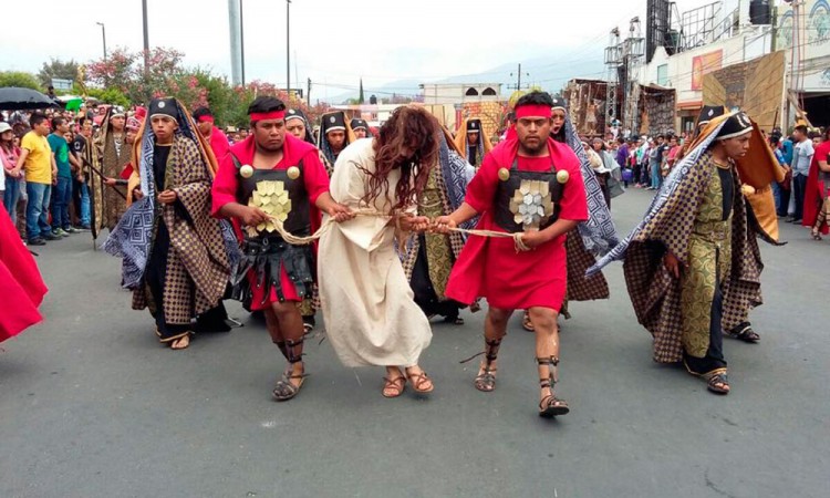 El grupo Pasión de Cristo en Tehuacán, con gran fe y entusiasmo por parte de cerca de 5 mil fieles del municipio, llevó a cabo la escenificación de la Pasión y Muerte de Jesucristo; Alejandro Rodríguez Luis, el joven que personifica al nazareno inició la tarde del Viernes Santo el recorrido hacia la meseta del Riego, en donde se desarrolló la crucifixión. Cargó una cruz de casi 120 kilogramos. Alrededor de las 11 horas se inició con la escenificación de diversos pasajes bíblicos en el estacionamiento de un centro comercial, entre ellos el juicio ante Pilatos. Fotos: Yomara PachecoPese a los intensos rayos del sol, las personas acompañaron a Rodríguez Luis. Asimismo, elementos de Tránsito y Policía Municipal, así como 40 elementos de Protección Civil y Bomberos, quienes resguardaron el orden y cuidaron la integridad física de los asistentes. Tras esta escenificación, el director de Protección Civil, Alejandro Rodríguez, reportó saldo blanco y que sólo asistieron a diez personas por insolación y deshidratación, mismos que fueron atendidos por paramédicos de Cruz Roja y Protección Civil. La representación del Grupo Pasión de Cristo culmina este sábado a las 7 horas con la misa de la bendición del fuego nuevo y agua bendita, así como con la escena de la Resurrección. Durante la misma tarde, otro grupo de personas a cargo del grupo denominado Semana Santa en Vivo, realizó en la junta auxiliar de San Lorenzo Teotipilco una representación similar de la Pasión y Muerte de Jesús; sin embargo, son los que integran La Pasión de Cristo cuentan con el aval de la Diócesis de Tehuacán. En esta representación también hubo saldo blanco. |