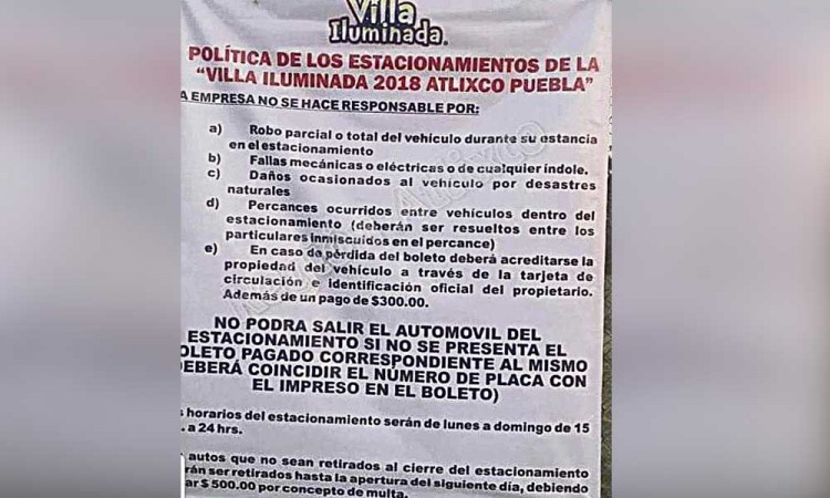 ATLIXCO - Los turistas que han llegado a Atlixco a visitar la Villa Iluminada se encuentran molestos, pues los costos de los estacionamientos son muy elevados, pero también es algo que ha afectado a otros estacionamientos que no forman parte del Ayuntamiento. También puedes leer: Causa confusión entrega de calcomanías para Villa Iluminada El Ayuntamiento hizo un llamado a usar los estacionamientos que forman parte del operativo de movilidad para la Villa Iluminada, pues el precio por cualquier vehículo automotor, sin límite de tiempo, es de 120 pesos, y en atención a la demanda turística, recibirán a los visitantes con tarifa preferencial, establecida en 35 pesos por hora. No obstante, algunas personas del municipio han acusado que el objetivo principal de habilitar estacionamientos fuera de la ciudad es para beneficiar a José Luis Galeazzi, exalcalde de Atlixco, que tiene terrenos en la junta auxiliar de la Trinidad Tepango y Santa Rita, así como al cuñado del edil actual, Guillermo Velázquez, que está buscando terrenos en renta por la zona del corredor gastronómico. |