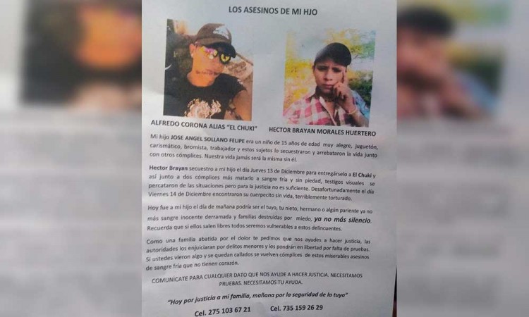 A través de las redes sociales circula una publicación donde una familia pide el apoyo de autoridades y ciudadanos del municipio de Chiautla de Tapia, para que dos presuntos responsables no sean puestos en libertad por falta de pruebas ante el secuestro y asesinato de un menor de edad perpetrado en días pasados. También te puede interesar: Dan 70 años de prisión a agresor sexual y homicida de menor El jueves 13 de diciembre reportaron la desaparición de José Ángel N, de 15 años de edad, y refirieron que fue visto a bordo de una motoneta color verde, sobre la carretera Chiautla de Tapia - San Miguel Ejido, acompañado de otro sujeto; sin embargo, horas más tarde fue encontrado sin vida, y lograron la aprehensión de dos hombres, señalados como presuntos homicidas. En dichas publicaciones aparecen las imágenes los dos sospechosos, identificados como Alfredo Corana alias El Chuki y Héctor Brayan Morales Huertero, a este último se le describe como el acusado de secuestrar al menor, a quien entregaría al otro implicado, quien junto a otras personas lo asesinaron a sangre fría. El pasado 14 de diciembre encontraron el cuerpo de José Ángel sin vida con huellas de tortura. Pese haber testigos visuales, esto no ha sido suficiente y las autoridades sólo los juzgarán por delitos menores. |