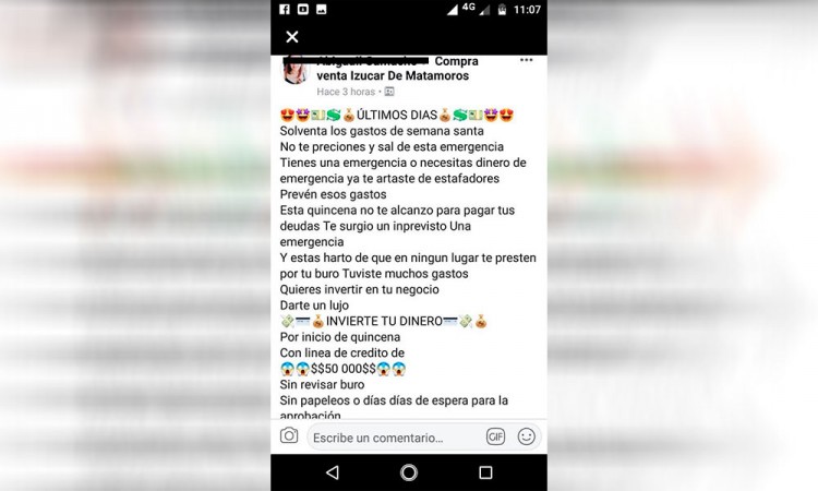 Un nuevo tipo de fraude se está registrando a través de redes sociales: esta vez ofrecen la venta de dinero falso. Publicaciones en Facebook ofrecen 30 mil pesos en billetes de 500 y 24 mil pesos en billetes de 200 pesos, los cuales presuntamente son falsos. Lee: Pausan producción de agua mineralEl mensaje puesto por el perfil de Abigail en redes sociales dice: "Solventa los gastos de Semana Santa, no te presiones y sal de esta emergencia. ¿Tienes una emergencia o necesitas dinero, ya te hartaste de estafadores?" Una vez que los interesados se comunican por mensaje, el perfil ofrece 60 billetes de 500 pesos por 2 mil pesos, o 120 billetes de 200 pesos por mil quinientos pesos. La persona promete que pasan cualquier prueba de agua, cuentan con la cinta de caracol movible y lucen igual que un billete original. Algunos ciudadanos que han pedido información remarcan que debe investigarse este nuevo fraude. |