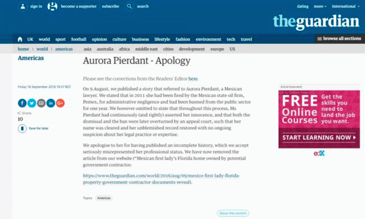 El diario británico The Guardian bajó de su sitio web el reportaje en el que acusaba a Angélica Rivera, esposa del presidente de México, Enrique Peña Nieto, de usar un departamento en Miami, Florida, propiedad del Grupo Pierdant, potencial contratista del gobierno federal. El rotativo borró la nota tras hacer pública una disculpa a Aurora Pierdant, hermana de Ricardo Pierdant, quien fue acusado el pasado 9 de agosto de ser el potencial contratista del gobierno de México y propietario de dicho inmueble. "Nos disculpamos con ella por haber publicado un historial incompleto, el cual se acepta que se ve seriamente tergiversado su estatus profesional. Ahora hemos eliminado el artículo de nuestro sitio web", indicó The Guardian. En la publicación se aseguró que Aurora Pierdant obtuvo beneficios gracias a la amistad de Ricardo con Enrique Peña Nieto; el diario agregó que la abogada especializada en contratos petroleros sacó provecho pese a haber sido despedida de Pemex e inhabilitada para ejercer un cargo público. The Guardian reconoció que en el reportaje sobre el departamento en Miami, se omitió que Aurora se declaró inocente en todo el proceso y que el despido y la inhabilitación fueron anulados por un tribunal de apelación, por lo que su nombre está limpio. El reportaje estaba titulado como "Casa de Florida de primera dama mexicana propiedad de potencial contratista del gobierno". Aurora agradeció a través de la red social Twitter a quienes la apoyaron. Con información de El Universal |