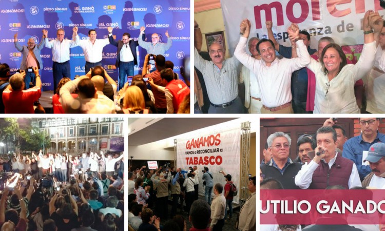 En las ocho entidades donde este domingo se eligió gobernador, sin contar la Ciudad de México, Morena se perfila como el virtual ganador en cuatro; Acción Nacional (PAN) en tres y Movimiento Ciudadano (MC) en una. Morena formó la alianza Juntos Haremos Historia con los partidos del Trabajo (PT) y Encuentro Social (PES), y arrebató al Partido de la Revolución Democrática (PRD) las gubernaturas de Morelos con su candidato, Cuauhtémoc Blanco Bravo, y la de Tabasco, con Adán Augusto López Hernández. El PAN también fue derrotado en Veracruz por Cuitláhuac García, de Morena, quien se impuso a Miguel Ángel Yunes Márquez, mientras que al Verde Ecologista le arrebató Chiapas con Rutilio Escandón, como candidato. En tanto, el aspirante de la coalición PAN-PRD-MC, Diego Sinhué Rodríguez Vallejo, es el virtual gobernador de Guanajuato al superar en votos dos a uno, a su más cercano contendiente, Ricardo Sheffield Padilla, candidato de la coalición Juntos Haremos Historia. El panista celebró con cientos de seguidores el resultado electoral, que refrenda a Guanajuato como el principal bastión del blanquiazul, después de 27 años en el poder, y desde ese momento expresó su determinación de establecer una relación de trabajo con el virtual presidente, Andrés Manuel López Obrador. En Yucatán, de acuerdo con un sondeo rápido de una muestra de 188 casillas, el candidato del PAN y Movimiento Ciudadano, Mauricio Vila Dosal, tendría un límite superior a 40.1 por ciento e inferior a 38 por ciento, por lo que estaría inicialmente arriba en la elección estatal. En Puebla, en el conteo rápido se declaró un "empate técnico" entre los candidatos de las coaliciones Juntos Haremos Historia, representado por Luis Miguel Barbosa, y Martha Erika Alonso, de Por Puebla al Frente, con una ligera ventaja para la aspirante. La tendencia del conteo rápido en Jalisco coloca como virtual ganador de la contienda al candidato de Movimiento Ciudadano, Enrique Alfaro Ramírez. El más cercano competidor del emecista es el aspirante de la coalición Juntos Haremos Historia, Carlos Lomelí, cuyo rango de votación está entre 23 y 25 por ciento. |