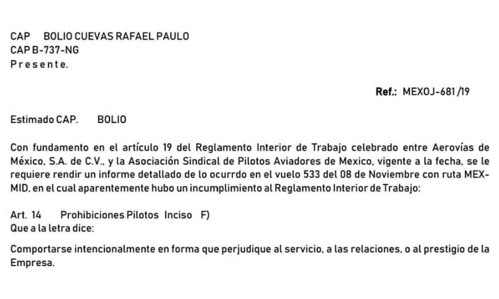 Luego de haber realizado una petición al presidente de la República, Andrés Manuel López Obrador, sobre la continuación del aeropuerto en Texcoco, el capitán de Aeroméxico, Rafael Bolio fue notificado por la empresa por incumplir el reglamento interior de trabajo. La aerolínea pide al capitán rendir un informe detallado acerca de lo ocurrido en el vuelo 533 del 8 de noviembre donde AMLO viajaba rumbo a Yucatán. También puedes leer: Piloto pide a AMLO mantener construcción de aeropuerto en Texcoco