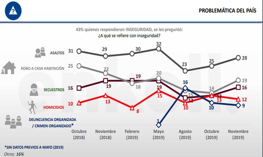 Otros delitos como la delincuencia organizada, relacionada al narcotráfico, no tuvieron el mismo nivel de importancia para los entrevistados, pues a un año de AMLO en el poder, menos del 10 por ciento la tomaron como el origen de la inseguridad. Puedes leer: A 6 meses de gobierno, AMLO tiene calificación más bajaInclusive, el robo a casa habitación (19) se colocó por arriba de los secuestros (16) y de los homicidios (12). No obstante, en todos los delitos mencionados anteriormente, el nivel de percepción delictuosa bajó.