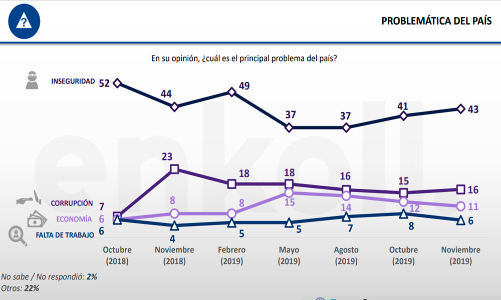 La percepción de inseguridad decreció nueve puntos desde que Andrés Manuel López Obrador asumió la Presidencia de la República, pues pasó de 52 inconformes por cada 100 habitantes al inició de su gestión a 43 en el presente mes. De acuerdo a una encuesta realizada por la consultora Enkoll a largo de los 12 meses de López Obrador al mando, el asalto es el delito de mayor impacto en la ciudadanía mexicana, pues 28 de cada cien personas así lo consideraron.