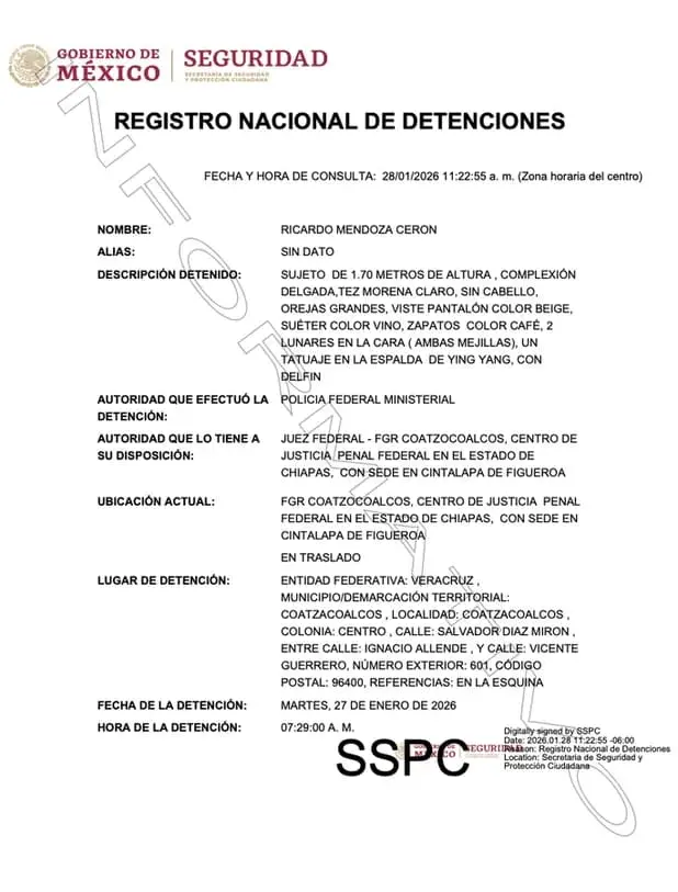 Autoridades federales capturaron en Coatzacoalcos, Veracruz, a un segundo implicado en el accidente del Tren Interoceánico que provocó la muerte de 14 personas. El implicado se trata de Ricardo N, quien de acuerdo con los registros oficiales del Ferrocarril del Istmo de Tehuantepec, se desempeñaba como Jefe de Departamento de Mecánica y Electricidad dentro del tren accidentado. En base a la información proporcionada por el Registro Nacional de Detenciones, Ricardo N fue detenido por miembros de la Policía Federal Ministerial ayer, martes 27 de enero, a las 7:20 en un domicilio de la colonia Centro en Coatzacoalcos.