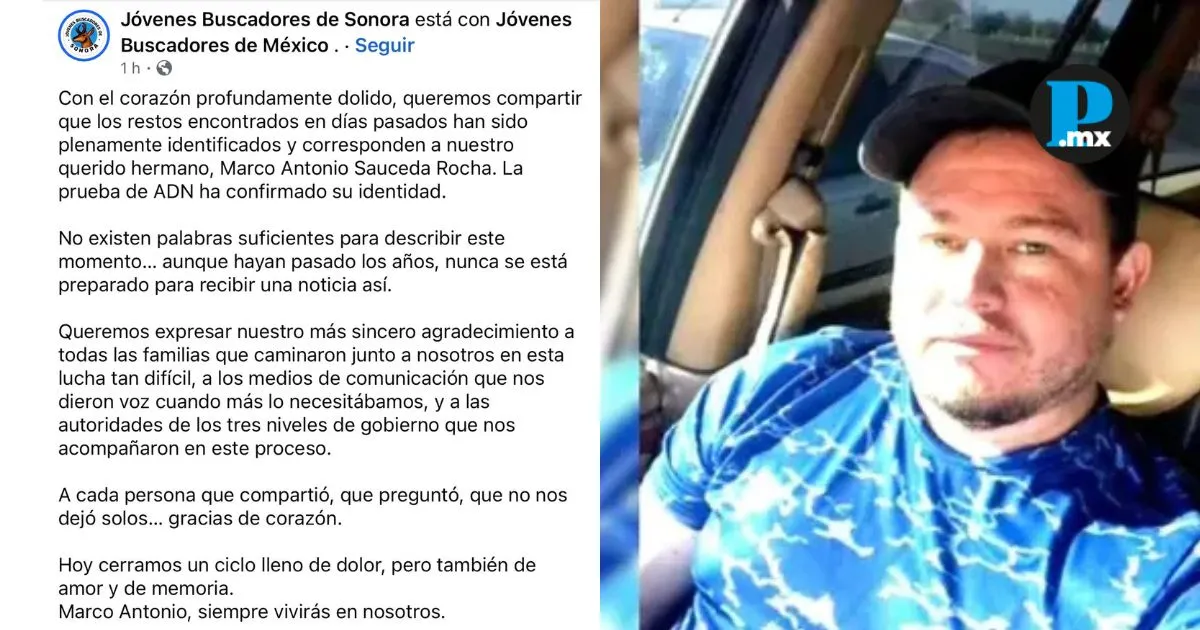 La activista Cecilia Patricia Flores Armenta, líder del colectivo Madres Buscadoras de Sonora, informó que los restos óseos localizados el pasado 24 de marzo de 2026 en un predio rural de Hermosillo corresponden a su hijo, Marco Antonio Sauceda Rocha, desaparecido desde el 4 de mayo de 2019. De acuerdo con información difundida por el colectivo Jóvenes Buscadores de Sonora, la identidad fue confirmada mediante pruebas de ADN, lo que permitió verificar oficialmente que los restos encontrados pertenecen al joven. En un comunicado, señalaron que “la prueba de ADN ha confirmado su identidad”, tras días de incertidumbre sobre los resultados periciales.