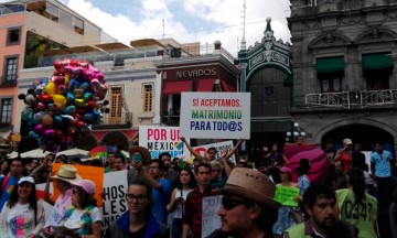 Un grupo cercano a las 300 personas de la Comunidad LGBTI de Puebla, activistas y personal de logística y apoyo, acudieron a la concentración citada para este domingo en el Parque Juárez, con el fin de exigir "un estado laico" y que el Matrimonio Igualitario sea establecido abiertamente en el Código Civil de la entidad. Entre los presentes destacan las comisiones de diversidad sexual del Movimiento de Regeneración Nacional (Morena), así como del Partido de la Revolución Democrática (PRD). También resaltan personajes como Armando Pliego Ishikawa, líder de Cholula en Bici y Alberto Merlo, ex candidato indpendiente a diputado federal en 2015 y la llamada "batucada feminista". Aunque los asistentes visten ropa colorida, no portan prendas con algún tono distintivo, como ocurrió este sábado, durante la Marcha por la Familia. Destaca que la marcha estaba citada a las 11 de la mañana, para partir hacia el Zócalo de la capital poblana; pero hasta las 11:38 de este día, los asistentes aún escribían pancartas. Foto: Elena Domínguez  Foto: Elena Domínguez Avanza la Marcha a favor del Matrimonio Igualitario en Puebla Al filo del mediodía, los asistentes a la marcha a favor del Matrimonio Igualitario en Puebla, avanzaron sobre el bulevar 5 de Mayo con dirección al Zócalo de la capital. Minutos antes, a un costado de la estatua de Benito Juárez, el grupo exigió un estado laico y que los jerarcas religiosos no se inmiscuyan en temas de legislación. En el trayecto, el contingente que no llegó a las 500 personas, recordó escándalos sexuales dentro de la iglesia Católica, como el caso del padre Marcial Maciel, fundador de Los Legionarios de Cristo, quien fue acusado de abusar sexualmente de varios miembros de su congregación. Cerca de la una de la tarde, la marcha a favor del Matrimonio Igualitario, ya con cerca de 800 asistentes, se adentró al Centro Histórico de Puebla. A su paso frente a los templos católicos, los asistentes lanzaron consignas contra la institución: A la 1:05 de la tarde, los manifestantes llegaron finalmente hasta las puertas de la Catedral de Puebla, frente a las cuales, insistieron en los casos de abuso sexual contra menores dentro de la iglesia Católica y lanzaron consignas como "matrimonio y adopción para toda la nación" o "si dios es amor ¿por qué odias tanto?". Foto: Elena Domínguez .jpeg) Foto: Elena Domínguez  Foto: Elena Domínguez Los integrantes de la marcha a favor del matrimonio igualitario cerraron su movilización con críticas hacia las autoridades, por lo que consideraron como una omisión al no proteger los derechos de las minorías. Desde los micrófonos del plantón que el Movimiento Regeneración Nacional mantiene bajo el asta bandera en el zócalo, exigieron que no se les discrimine y por tanto, se legisle abiertamente por las uniones entre personas del mismo sexo. |