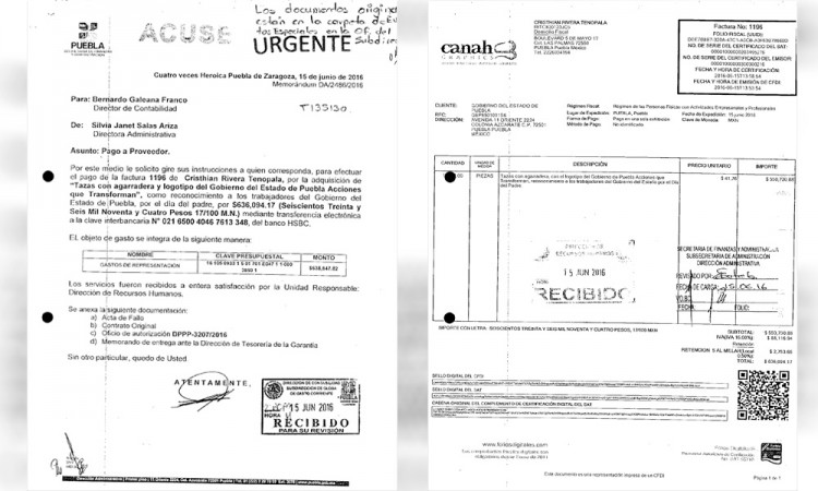 El gobierno de Rafael Moreno Valle Rosas habría adquirido miles de tazas con un sobrecosto de 40 por ciento. Mientras pagó 550 mil 730 pesos por 13 mil 188 piezas, con un costo unitario de 41 pesos sin Impuesto sobre el Valor Agregado (IVA), en el mercado, la misma empresa las oferta en 25 pesos sin aplicar el impuesto. En el apartado de gastos de representación de la página de transparencia, el gobierno del estado hizo públicas las cantidades erogadas para llevar a cabo distintos eventos del 2016 a la fecha, como la contratación de coffee break, el pago de alimentos para las reuniones de funcionarios, la adquisición de productos ajenos a papelería y hasta jardineras ornamentales, todo ello sumó 718 mil 756 pesos. La inversión más elevada fue la erogada en junio de 2016 para pagar las tazas con agarradera y logotipo del gobierno del estado, como reconocimiento a los trabajadores por el Día del Padre, los cuales tuvieron un costo total de 636 mil 94 pesos. En la factura publicada en la página de transparencia, se observa que el precio unitario fue de 41.76 pesos y el importe de 550 mil 730.88 pesos. Aunque no es visible la cantidad de unidades adquiridas, al realizar la operación se tiene que la solicitud fue de 13 mil 188 tazas. Con los impuestos agregados, se tiene que el gasto fue de 636 mil 94.17 pesos. El Popular, diario imparcial de Puebla, se puso en contacto con la empresa proveedora de las tazas, Canah Graphics y el personal explicó que cada pieza con algún logotipo cuesta 45 pesos; a partir de tres, el precio es de 35 pesos; pero a partir de mil unidades el costo es de 25 pesos cada una, más IVA. Esta casa editorial realizó cotizaciones en al menos cinco negocios dedicados a la impresión de productos publicitarios en el Centro Histórico. En todos los casos, el costo por unidad con un pedido de mil tazas va de los 25 a los 29 pesos y dependiendo el establecimiento, el costo es neto o más IVA. Mientras tanto, una sola taza rotulada cuesta de 35 a 45 pesos, incluso se venden por tipo de taza, tamaño y color del logotipo que se quiera imprimir, el precio en todos los casos se eleva si no se entrega un diseño y el establecimiento también debe realizarlo, el cargo es de hasta 10 pesos por pieza. Factura de compra de Tazas gobierno de RMV by Arturo Castillo on Scribd