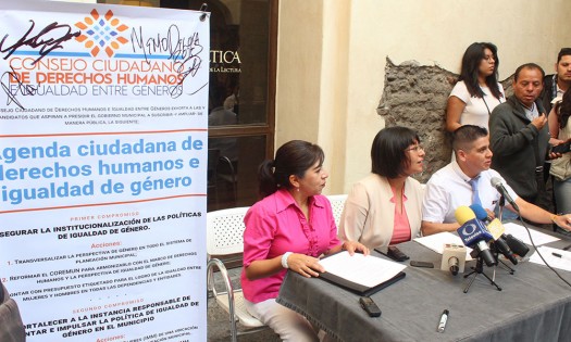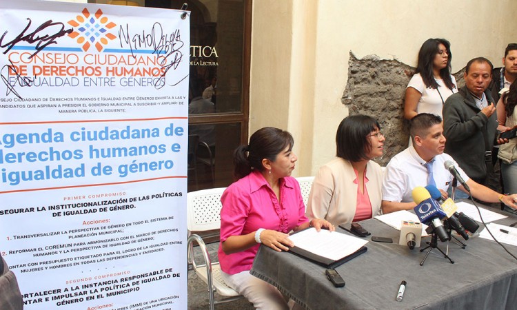 | Sólo cuatro de los siete candidatos a la alcaldía de Puebla acudieron a la firma de una agenda propuesta por el Consejo de Derechos Humanos e Igualdad entre Géneros, donde se les solicitó mayor interés en el tema porque se siguen presentando actos de discriminación y violencia hacia los grupos vulnerables. En la firma de acuerdos estuvieron los candidatos de los partidos Revolucionario Institucional (PRI), Guillermo Deloya Cobián; Compromiso Por Puebla (CCP), Gonzalo Juárez Méndez; Pacto Social de Integración (PSI), Víctor Gabriel Chedraui; y la coalición Juntos Haremos Historia, Claudia Rivera Vivanco. Los ausentes fueron el abanderado de Por Puebla al Frente (Partido Acción Nacional, Partido de la Revolución Democrática y Movimiento Ciudadano), Eduardo Rivera Pérez, así como la candidata Partido Nueva Alianza (Panal), Ernestina García Chávez y la del Partido Verde Ecologista de México (PVEM), Ana Paola Migoya Velázquez. En conferencia de prensa, el vocal de la organización civil, Tuss Fernández Hernández, refirió que convocaron a todos los aspirantes a la presidencia municipal de Puebla, pero sólo Eduardo Rivera Pérez les notificó que no podría asistir, aunque se sumaba al proyecto que le hicieron llegar. Detalló que en el caso de la candidata del PVEM, aceptó la invitación pero no llegó; del Panal dijo que acudieron a solicitar su participación, pero no hubo respuesta de asistencia o motivos para su falta. "Teníamos que hacer pública esta agenda, no necesariamente (…) era contar con la presencia de los candidatos, pero agradecemos a quienes estuvieron aquí, también a quiénes nos hicieron llegar su postura, como Lalo Rivera", externó. Por su parte, la presidenta del consejo, Vianeth Rojas Arenas, recordó que la agenda entregada se dividió en tres ejes: asegurar institucionalización de las políticas; fortalecer a la institución responsable de orientar e impulsar la igualdad de género; y crear medidas para evitar la violencia y discriminación entre grupos vulnerables. Precisó que entre las estrategias se encuentran el darle perspectiva de género al sistema de planeación en el municipio, etiquetar recursos para impulsar la equidad de sexos en las dependencias y reforzar las funciones del Instituto Municipal de la Mujer.