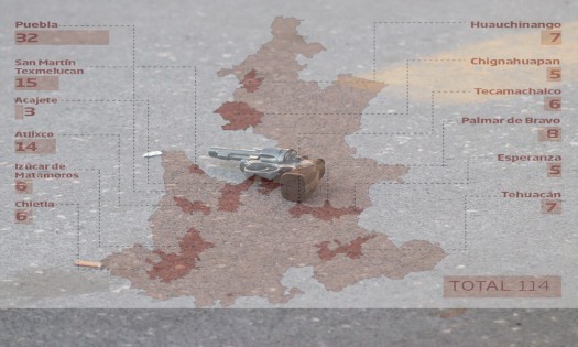Durante la noche del pasado 2 de junio se registró el último homicidio en Puebla con arma de fuego, pues asesinaron a la candidata a diputada local por el distrito 2 de Huauchinango, por el Partido Verde Ecologista de México (PVEM), Juana Maldonado Infante y a la regidora de Juan Galindo, Erika Cázares. A nivel estatal, la Fiscalía General del Estado (FGE) le informó al Gobierno Federal que investigaron 31 homicidios dolosos con armas de fuego en la capital del estado, convirtiéndose en el municipio con el registro más alto, además de que mostró un comportamiento inusual al incrementarse los casos. Los 31 homicidios registrados en la capital poblana durante el primer cuatrimestre de este año, significaron que en promedio se atendieron dos por semana que, en comparación con los 12 incidentes del mismo periodo de 2017, indicaron un incremento mayor al 158 por ciento en la actividad delictiva. Por debajo de la capital poblana de colocó San Martín Texmelucan, al concluir enero y abril con 15 asesinatos armados que, en contraste con el único caso del mismo periodo de 2017 representó un incremento en la violencia superior a mil 400 por ciento. El pasado 2 de mayo las secretarías de la Defensa Nacional (Sedena), Seguridad Pública (SPP) y la FGE montaron un operativo en el que desarmaron a 185 policías municipales de San Martín Texmelucan, al ser señalados por estar coludidos con bandas de robo de hidrocarburo de la zona. También destacó la actividad de Atlixco, ya que en el primer cuatrimestre de este año concluyó con 14 asesinatos armados, cuando en los mismos meses pero de 2017 se investigaron ocho homicidios dolosos, lo que indicó que las ejecuciones investigadas aumentaron en 75 por ciento. Palmar de Bravo también encabezó los municipios con más decesos por armas de fuego en la entidad, pues al cierre del primer cuatrimestre cerró con ocho investigaciones; mientras que durante el mismo periodo de 2017, sólo tuvo cuatro incidentes, es decir, aumentaron en 100 por ciento. El pasado 17 de mayo secuestraron al aspirante independiente a la presidencia municipal de Palmar de Bravo, Ángel Morales Ugalde, quien se dirigía a una gasolinera de su propiedad en la demarcación, donde perdieron contacto con él y hasta el cierre de esta edición se desconoce su paradero. |