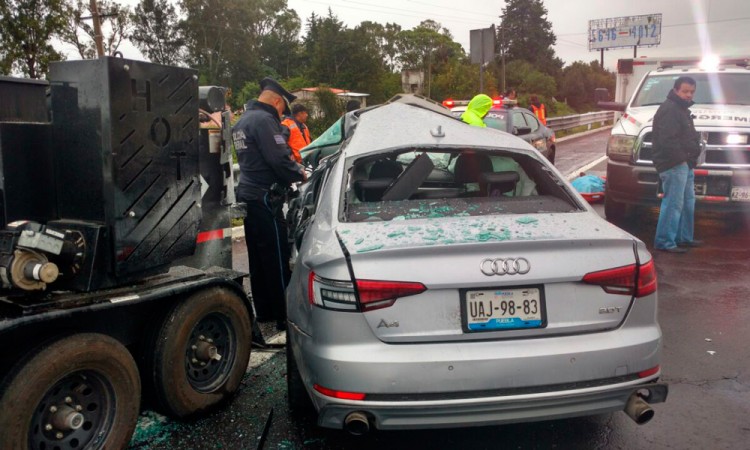El conductor de un automóvil Audi color gris perdió la vida en un percance vehicular en la autopista México-Puebla, con dirección a la Ciudad de México. Se presume que por el exceso de velocidad y las malas condiciones climatológicas perdió el control de la unidad y se impactó contra una camioneta tipo semirremolque, la cual se encontraba estacionada a un costado de la pista a la altura del kilómetro 081+000. El mortal accidente ocurrió alrededor de las 8:30 horas de ayer jueves a la altura de San Martín Texmelucan. Al ser reportado el percance acudieron los policías federales de la Estación Zaragoza y paramédicos de Caminos y Puentes Federales (Capufe), estos últimos confirmaron que el conductor había fallecido y que dos de sus acompañantes estaban lesionados. De acuerdo con los primeros peritales, el conductor de un Audi modelo 2017, color gris, con placas de circulación UAJ9883 del estado de Puebla, perdió el control de la unidad y se impactó contra la camioneta tipo semirremolque, color blanco, modelo 2013, con placas RK05575 del estado de Nuevo León. El hoy occiso es un hombre de aproximadamente 55 años de edad, cuyo cadáver fue levantado por la Policía Federal, con el apoyo del personal de participación social de la Fiscalía General del Estado. Las recomendaciones por parte del Comisario de la Policía Federal, Teófilo Gutiérrez a los automovilistas, debido al mal tiempo, son: conducir respetando los límites de velocidad, hacerlo con las luces encendidas, circular con precaución, utilizando el cinturón de seguridad y no utilizar el celular cuando se va manejando. Fotos: Jorge Fonseca/Édgar Herrera |