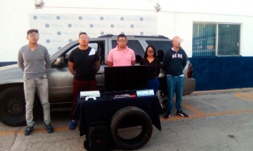 Una banda de presuntos ladrones de casa habitación fue capturada por habitantes del fraccionamiento Galaxia Bosques de Amalucan; se les sorprendió cuando intentaban meterse a un domicilio y se amagó con lincharlos. La Policía Municipal de Puebla capital llegó y procedió a retirar a los 4 hombres y 1 mujer. Se les aseguró una camioneta Chevrolet con placas YJW-9157. Esta banda ingresó a una casa del bulevar del Bosque, calle 12-B, donde pretendían sustraer objetos de valor. Ya tenían en su poder 1 pantalla de plasma y 1 consola de juegos de video. Se trata de Cristian R, de 31 años; Alán V, de 17; Juan Francisco C, de 27; Enrique Azared G, de 26; y Selene G, de 29. Se investiga si están involucrados con otros robos. |