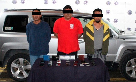 Policías municipales detuvieron la noche del lunes a tres presuntos asaltantes, a quienes se les señala de haber atracado la taquería La Oriental ubicada en Calzada Zavaleta. Luego de que los delincuentes perpetraran el atraco, la policía dio seguimiento a los delincuentes hasta inmediaciones de la calle Zacapoaxtla, entre Pedro Moreno y avenida Nacional, colonia Vicente Guerrero. Allí además les aseguraron una camioneta Jeep Patriot gris. Se les encontraron 14 teléfonos celulares y 5 carteras, propiedades de las víctimas del asalto. Los detenidos son Julio César C, de 28 años de edad; Jaime Antonio G; y Roberto L, de 41. En ese orden, dijeron dedicarse a la compra venta de fierro viejo, a la verdulería y a la venta de celulares en el mercado Independencia. Fueron puestos a disposición del Ministerio Público por el delito de robo para que se les finque las responsabilidades del caso. |