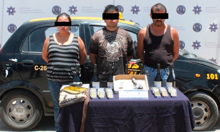 Tres asaltantes de tiendas Oxxo que operaban en un vehículo tipo taxi, fueron detenidos por la Policía Municipal en la capital poblana el jueves por la tarde. Se les aseguró mercancía robada y un arma de fuego. Entre los detenidos hay dos hombres y una mujer, a quienes se les detuvo después de que atracaran una de las tiendas de esta cadena comercial en la capital del estado. Al momento de ser aprehendidos se les aseguraron cajetillas de cigarros que habían sustraído momentos antes. Durante la revisión se les encontró un arma de fuego tipo escuadra, también cinco botellas de licor producto del hurto a mano armada que habían cometido. Los tres probables delincuentes se identificaron como Víctor Hugo R, de 35 años de edad; Cristián B, de 30; y Gricela T, de 32. También quedó bajo resguardo policial el vehículo tipo taxi en el que operaban para escapar después de cometer sus atracos. Fueron remitidos a la Dirección de la Policía Municipal en Rancho Colorado para su posterior puesta a disposición del Ministerio Público del fuero común. Se investiga si esta banda está involucrada en otros atracos similares. |