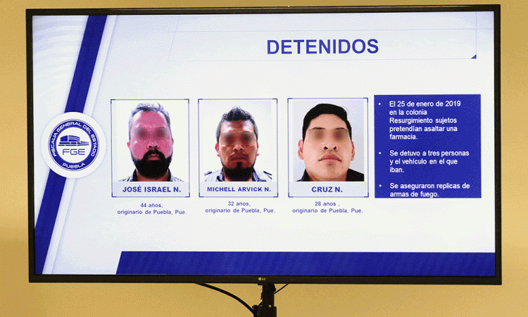 Agentes de la Fiscalía General del Estado (FGE) de Puebla detuvieron en la colonia Resurgimiento, a tres sujetos vinculados con varios robos a comercio y asalto a transeúntes en la capital. El director de la Agencia Estatal de Investigación (AEI) Juan Luis Galán Ruiz, reportó que el aseguramiento ocurrió a las 20 horas del 25 enero, en las calles 14 Oriente y 26 Norte, cuando los agentes ubicaron a tres hombres dentro de un vehículo Chevrolet Malibu gris, con placas del Estado de México. De dicha unidad descendieron dos hombres que se colocaron gorras para cubrirse el rostro mientras el otro varón se quedó dentro del auto en el asiento del conductor. Los agentes dieron aviso al centro de mando acerca de su operación solicitando el apoyo para su aseguramiento, cuando se dirigían a una farmacia para asaltarla. Los detenidos son Cruz N, José N y Michel N, a quienes se les aseguraron dos réplicas de armas y otros objetos. La FGE pide el apoyo de la ciudadanía para en caso de reconocerlos acudir a denunciarlos ante dicha autoridad. |