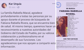 Después de seis días de estar reportada como desaparecida, Fabiana Rabiella Rivera, estudiante de 16 años de edad, fue localizada con vida y se encuentra con sus familiares. La menor de edad fue ubicada en el estado de Tabasco y únicamente se reportó que se encuentra bien de salud, aunque no se dieron más detalles; aunque más tarde trascendió que la joven decidió irse por su cuenta, junto con su pareja sentimental. Personal de la Fiscalía General del Estado (FGE) señaló que las diligencias por el caso continúan, aunque tampoco amplió detalles. Fue la mañana de este lunes, seis días después de la desaparición, que sus familiares postearon en redes sociales el hallazgo de Fabiana. "Gracias a Dios ya fue localizada por favor si me pueden ayudar compartiendo y muchas gracias a todos los que lo hicieron posible". Puedes leer: Desaparecen tres jóvenes poblanas en una semana"La familia Rabiella Macal, agradece profundamente a todas las personas por su apoyo durante el proceso de búsqueda de Fabiana Rabiella Rivera, que se encuentra bien de salud. Al mismo tiempo, queremos hacer un reconocimiento a nuestras autoridades del Gobierno del Estado de Puebla, por su valiosa colaboración y profesionalismo en el desempeño de sus funciones. Les agradecemos que nos apoyen a compartir esta información", publicaron familiares. Cabe recordar que la mañana del 23 de abril la estudiante de la preparatoria Enrique Cabrera Barroso, de la BUAP, salió de su domicilio en la colonia Jardines de San Manuel para ir a clases. Sin embargo, nunca llegó a su destino y tampoco a su vivienda por lo que su familia comenzó una búsqueda en redes sociales y su imagen se viralizó Los familiares también acudieron a presentar la denuncia a la FGE, quien comenzó su búsqueda y originó la carpeta de investigación 7981/2019, de la Zona Centro.