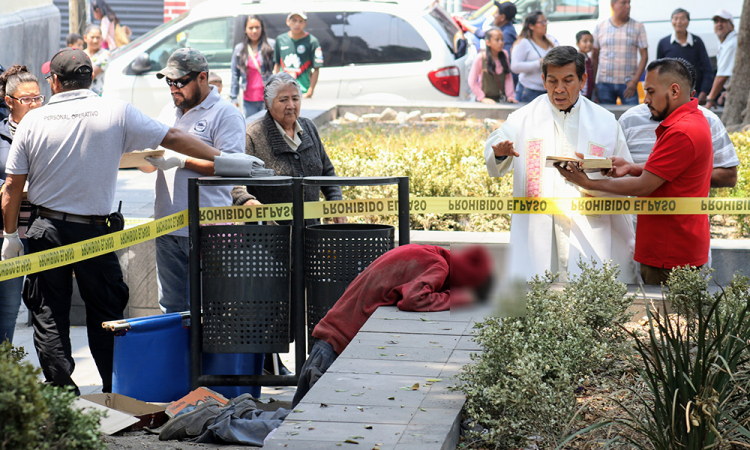 De rodillas, frente a una jardinera y de espaldas al templo de El Señor de los Trabajos, falleció un hombre en situación de calle en el Centro Histórico. El varón contaba con aproximadamente 65 años de edad y sólo era conocido por vecinos y comerciantes como El Abuelito, aunque desconocían su nombre. De acuerdo con colonos, el varón tenía alrededor de un año pasando las noches frente al templo, aunque en el día desconocían a dónde se iba. Alrededor de las 9 horas de ayer domingo, feligreses que salían del mencionado templo vieron al hombre en una posición muy extraña. El adulto mayor se encontraba inmóvil, de rodillas, con los brazos y cabeza apoyados en la parte de concreto de una jardinera, por lo que dieron aviso al 911. Policías municipales, así como personal de atención prehospitalaria acudieron al templo, ubicado en la calle 11 Norte y la esquina con la 10 Poniente, donde valoraron al adulto mayor y decretaron que había fallecido. También puedes leer: Cruz Roja les niega atención; fallecen por herida de balaEl cuerpo no presentaba traumas visibles o heridas, por lo que se determinó que falleció de causas naturales, debido a un infarto. Los policías acordonaron el área y solicitaron la intervención de elementos de la Fiscalía General del Estado (FGE), para las diligencias de levantamiento de cadáver. Las pesquisas se realizaron frente a personas que comían en un puesto de memelas, y los devotos que salían y entraban al templo. Antes del levantamiento del cuerpo, un sacerdote salió de la iglesia para ofrecer unas oraciones por el eterno descanso del indigente.