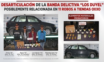 Derivado de la conjugación de labores de operatividad e inteligencia policial, la Secretaría de Seguridad Pública y Tránsito Municipal (SSPTM) de Puebla logró la desarticulación de la banda delictiva “Los Duyel”, integrada por Óscar “N.”, alias “El Cachetes”, de 24 años de edad; Luis Héctor “N.”, alias “El Gnomo”, de 19 años de edad; Eduardo Uriel “N.”, alias “El Mickey” y Víctor “N.”, alias “El Tiro”, ambos de 18 años de edad, posiblemente relacionada en la comisión de al menos 11 robos a tiendas de conveniencia.