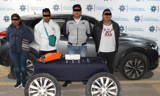La Secretaría de Seguridad Pública y Tránsito Municipal (SSPTM) de Puebla detuvo en la colonia 10 de Mayo a Roberto “N.”, de 39 años de edad; Araceli “N.”, de 37 años de edad; Jorge “N.”, de 33 años de edad y Erick “N.”, de 20 años de edad, por su probable participación en hechos con apariencia de delito de robo de autopartes. Mediante recorrido preventivo se percataron sobre la presencia de una ciudadana quien pidió apoyo para detener a los ocupantes de una camioneta Nissan, Kicks Sense, color gris, que había robado tres neumáticos a un vehículo marca Suzuki de su propiedad. También puedes leer: Registran tres asaltos al transporte público en la ciudadEn consecuencia, los elementos emprendieron una persecución que culminó al instante con la detención de la unidad y cuatro tripulantes, quienes fueron plenamente reconocidos por la víctima como responsables de cometer el acto ilícito. Adicionalmente, se recuperaron las autopartes robadas y se aseguró herramienta diversa, con la cual se presume los ahora detenidos usaron para consumar el robo. Los indiciados y elementos materiales probatorios fueron puestos a disposición del Agente del Ministerio Público, para la apertura de la Carpeta de Investigación correspondiente.