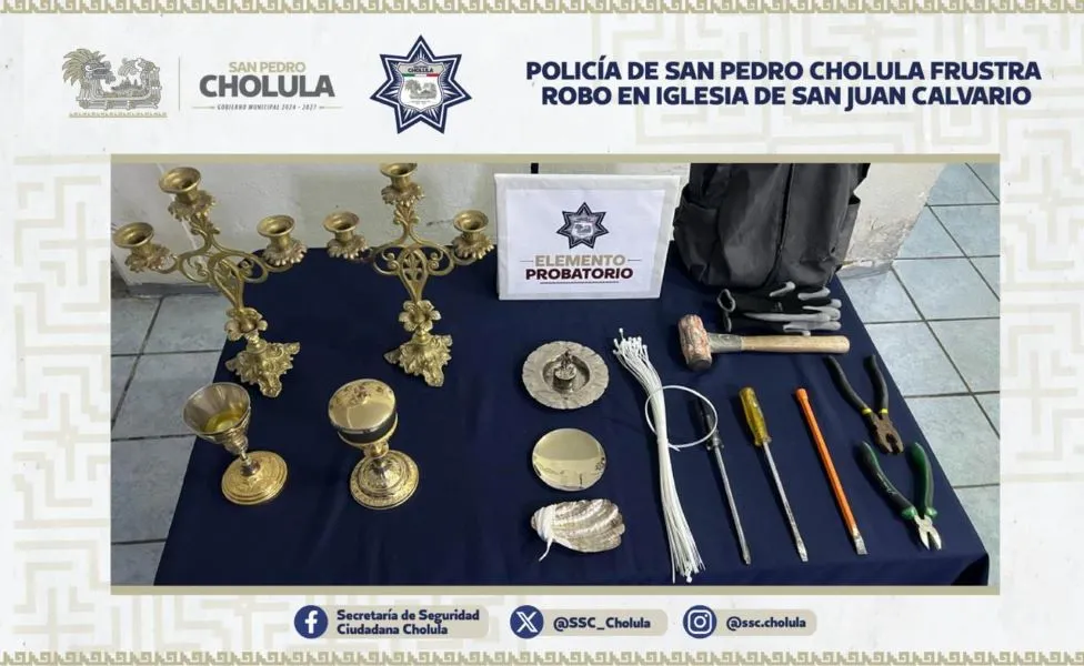 La intervención de corporaciones de seguridad permitió evitar el robo de piezas de arte sacro en una iglesia de San Pedro Cholula, un hecho que resalta la importancia de la vigilancia para la protección del patrimonio histórico y religioso que forma parte de la identidad de los barrios del municipio. Elementos de la Secretaría de Seguridad Ciudadana de San Pedro Cholula (SSC Cholula), lograron frustrar el robo de piezas de arte sacro en la iglesia de San Juan Calvario, ubicada en el barrio del mismo nombre, además de la detención de cuatro probables responsables. Te puede interesar: Colocan Bando del Carnaval 2026 en San Pedro Cholula; garantizan seguridad Durante la madrugada de este lunes se recibió el reporte de un allanamiento en el templo localizado en la calle 4 Poniente, esquina con 11 Norte, por lo que de inmediato se activaron unidades del sector y se desplegó un operativo con la participación del grupo táctico de la Policía Municipal. En recorridos de inspección en el perímetro, los elementos detectaron a cuatro hombres que brincaban la barda del inmueble e intentaban darse a la fuga en distintas direcciones; gracias a la rápida reacción y coordinación operativa, se logró su persecución, localización y aseguramiento. ![]() Tras la inspección, entre sus pertenencias fueron localizadas las piezas faltantes, así como herramientas y diversos utensilios presuntamente utilizados para cometer el ilícito. Los cuatro sujetos fueron puestos a disposición de la autoridad competente por su probable responsabilidad en los delitos de allanamiento y robo. El gobierno municipal de San Pedro Cholula, encabezado por la presidenta Tonantzin Fernández, refrenda su compromiso de trabajar de la mano con los barrios para proteger el patrimonio histórico, cultural y religioso del municipio, con cero tolerancia a quienes atenten contra la historia y la fe de la comunidad.