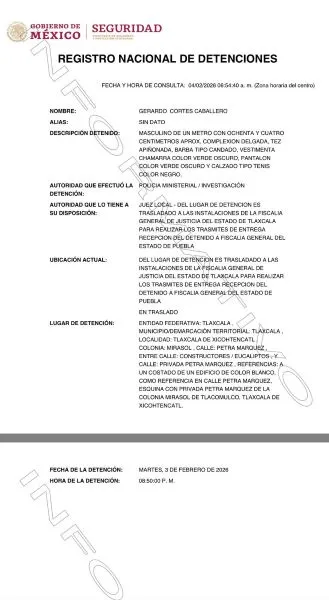 Tras ser buscado por la Fiscalía General del Estado de Puebla (FGE), elementos de la Fiscalía General de Justicia del Estado de Tlaxcala, en coordinación con la Guardia Nacional, detuvieron al expresidente del municipio poblano de Cuautempan, Gerardo Cortés Caballero, tras un operativo realizado en la colonia Mirasol de Tlacomulco. La captura se concretó la noche del martes, alrededor de las 20:50 horas, cuando el exalcalde fue ubicado por autoridades de Tlaxcala. De acuerdo con información oficial, al notar la presencia de los elementos de seguridad, Cortés Caballero intentó darse a la fuga, lo que derivó en una persecución inmediata. Te puede interesar: Congreso desaparece Ayuntamientos de Ahuazotepec y Cuautempan y nombra Concejos Municipales La detención estaba prevista inicialmente en la comunidad de Ixtulco; sin embargo, el intento de huida obligó a modificar el despliegue operativo y permitió su aseguramiento en un punto distinto de la capital tlaxcalteca. El exedil fue trasladado a las instalaciones de la Fiscalía General del Estado de Tlaxcala, donde se realizaron los trámites correspondientes de entrega-recepción, a fin de que sea puesto a disposición de las autoridades poblanas que lo requieren. De acuerdo con las investigaciones, Cortés Caballero permanecía prófugo desde mayo de 2025, luego de que autoridades judiciales emitieran una orden de aprehensión en su contra por diversos delitos del fuero común y federal, derivados de indagatorias de la FGE. Entre los señalamientos que enfrenta el alcalde con licencia se encuentran los delitos de extorsión y cobro de piso, secuestro, narcomenudeo y venta de drogas, así como portación ilegal de armas de fuego de uso exclusivo del Ejército, de acuerdo con expedientes ministeriales.