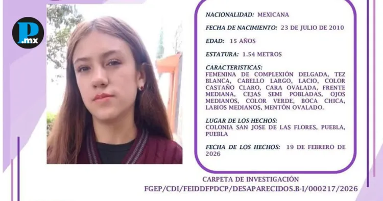 La Fiscalía General del Estado activó el Protocolo Alba para localizar a Melanie Yaretzi Mora García, una adolescente de 15 años reportada como desaparecida en la ciudad de Puebla. De acuerdo con el boletín de búsqueda, la menor fue vista por última vez el 19 de febrero de 2026, cuando salió de su domicilio ubicado en la colonia San José de las Flores, en la capital poblana. Melanie indicó que acudiría a una papelería cercana, sin embargo, desde ese momento se desconoce su paradero. Melanie Yaretzi Mora García es de nacionalidad mexicana, mide 1.54 metros, es de complexión delgada, tez blanca, con cabello largo, lacio y castaño claro. Tiene ojos verdes, cara ovalada y no cuenta con señas particulares. Al momento de su desaparición vestía sudadera negra, pants negro y tenis blancos. La carpeta de investigación quedó registrada bajo el número FGEP/CDI/FEIDDFPDCP/DESAPARECIDOS.B-I/000217/2026, y las autoridades solicitaron el apoyo de la ciudadanía para compartir cualquier información que ayude a dar con su ubicación. Te puede interesar: Reportan desaparición de matrimonio en colonia Bella Vista; Fiscalía emite alerta Cualquier dato que contribuya a la localización de la adolescente puede proporcionarse de manera confidencial y anónima a los teléfonos 22 12 83 81 42, 22 22 14 64 02 y 22 22 14 64 05, así como al correo electrónico boletin.protocolo.alba.fge@fiscalia.puebla.gob.mx.