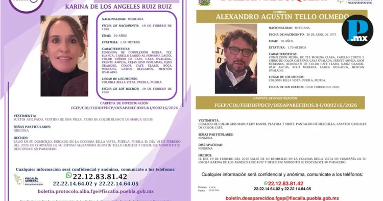 Una pareja fue reportada como desaparecida desde el 19 de febrero de 2026, luego de salir de su domicilio ubicado en la colonia Bella Vista, en la ciudad de Puebla. La Fiscalía General del Estado emitió boletines de búsqueda y solicitó el apoyo de la ciudadanía para dar con su paradero. Se trata de Alexandro Agustín Tello Olmedo y Karina de los Ángeles Ruiz Ruiz, ambos de 50 años de edad, quienes salieron juntos ese día y desde entonces no se ha tenido información sobre su ubicación, de acuerdo con los reportes oficiales. Alexandro Agustín Tello Olmedo mide 1.70 metros, es de complexión media, tez morena clara y cabello corto y chino, color castaño. Al momento de su desaparición vestía chaleco gris marca Eddy Bauer, playera tipo T-shirt, pantalón de mezclilla y zapatos casuales color café. No presenta señas particulares ni alguna discapacidad. Por su parte, Karina de los Ángeles Ruiz Ruiz mide 1.55 metros, es de complexión media, tez blanca y cabello largo al hombro, lacio y teñido de color café. Vestía suéter afelpado, vestido de una sola pieza y tenis blancos marca Guess. Su caso se investiga bajo el Protocolo Alba, mecanismo de búsqueda inmediata para mujeres desaparecidas. Te puede interesar: Matan a conductor de Coronango en San Bernabé Temoxtitla; hallan su auto a unas calles Ambos casos quedaron integrados en la carpeta de investigación FGEP/CDI/FEIDDFPDCP/DESAPARECIDOS-B-I/000216/2026. La Fiscalía informó que cualquier información que contribuya a su localización será recibida de manera confidencial y anónima. Las autoridades pusieron a disposición los teléfonos 22 12 83 81 42, 22 22 14 64 02 y 22 22 14 64 05, así como los canales oficiales de la Fiscalía General del Estado de Puebla.